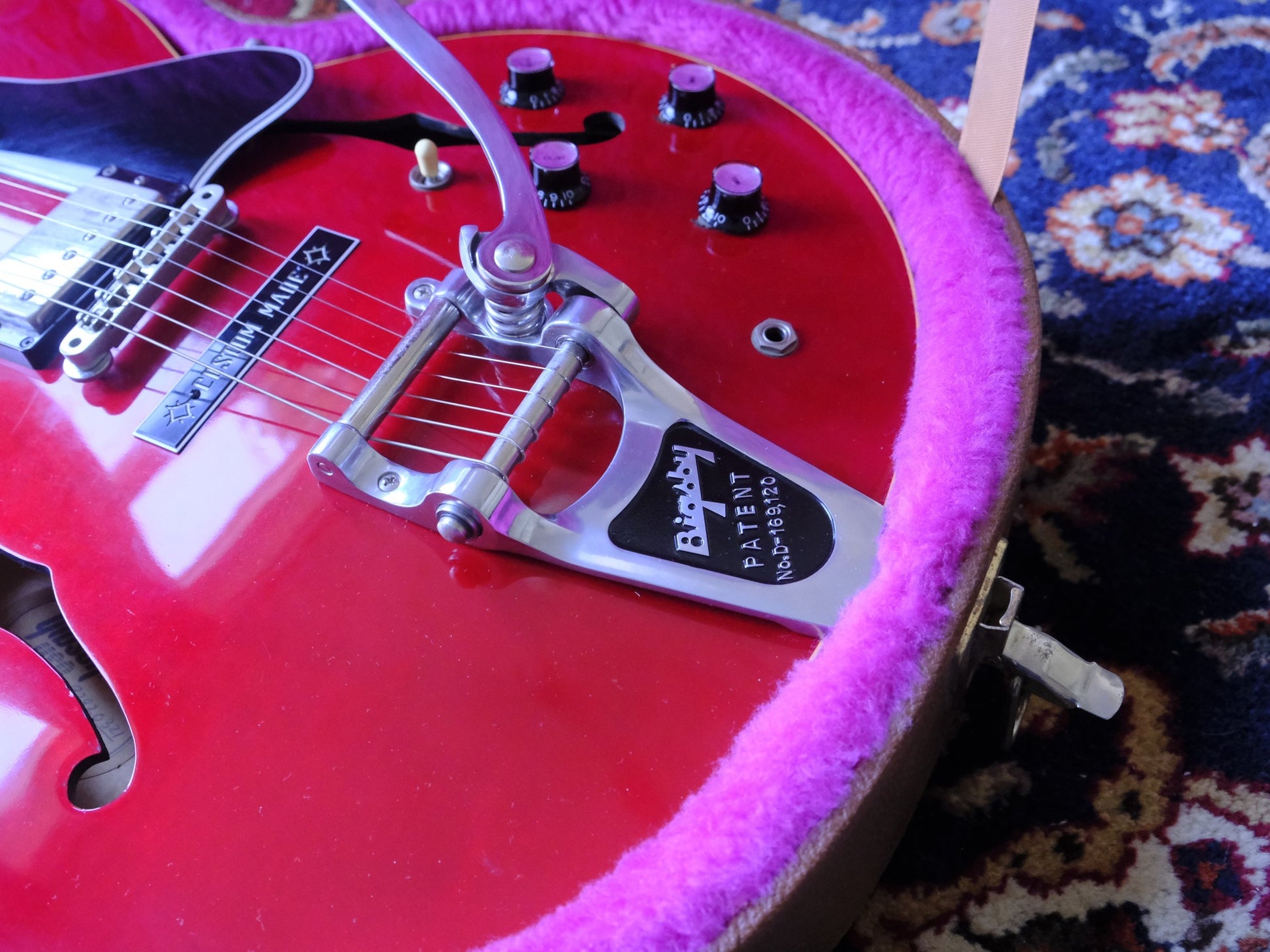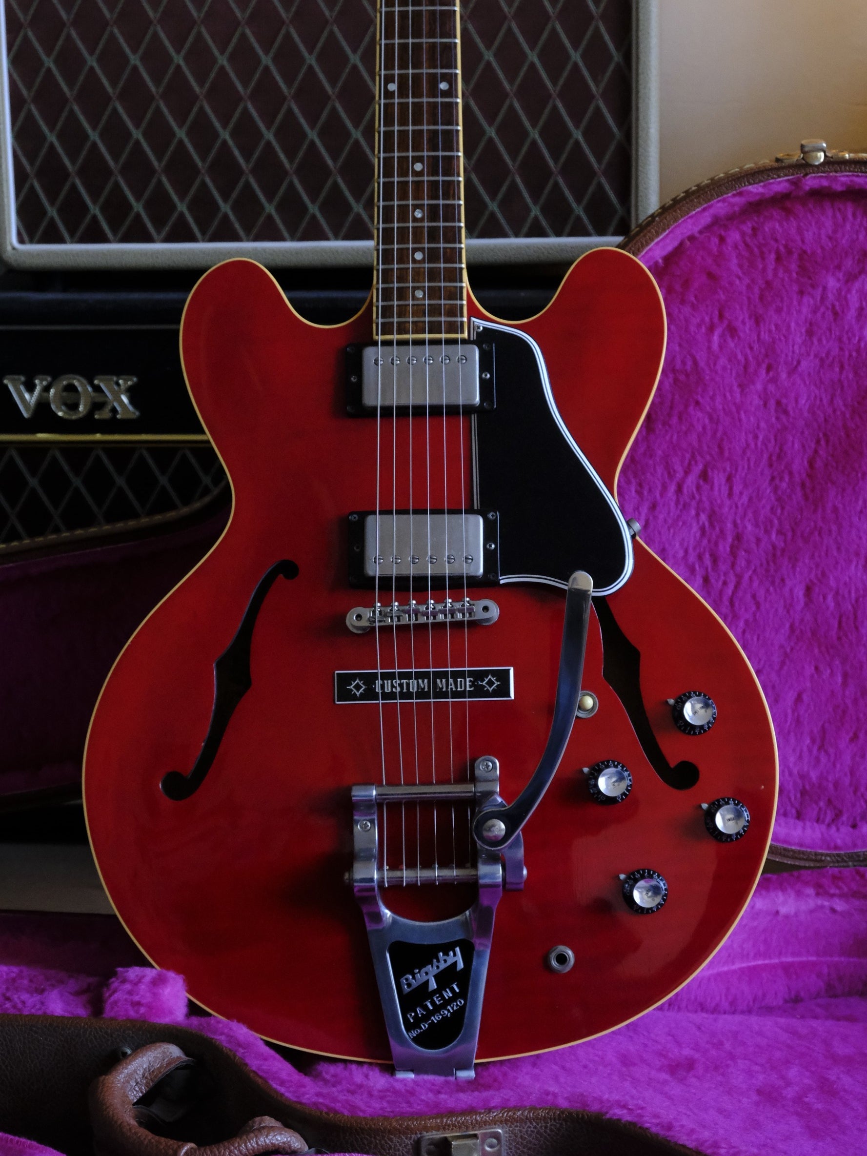 The previous owner got the inspiration from a 1963 Gibson ES-335 Custom. A Bigsby Vibrola and a custom-made plate were added, and the knobs were changed. The original bridge, knobs, and pickguard are included. The guitar has been cleaned, fretboard oiled, and set up with .10 strings. It plays amazingly and has a great tone!